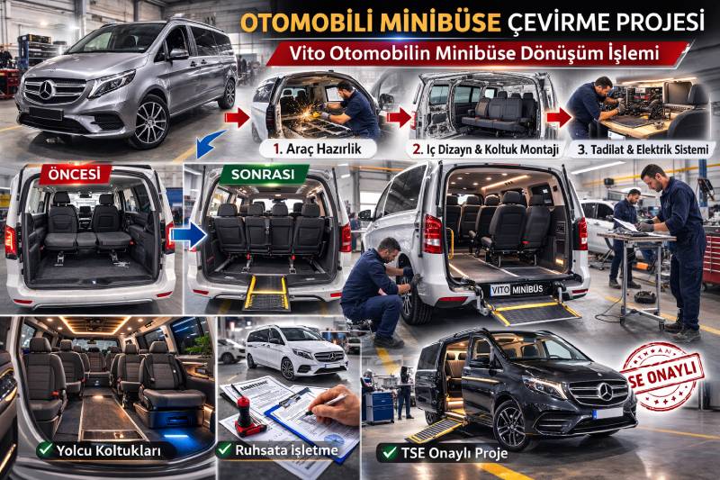 Otomobili minibüse çevirme projesi veya minibüs/kamyonet ruhsatlı aracı otomobil ruhsata dönüştürme işlemi, mutlaka resmi proje süreci ile yürütülmelidir. TSE onayı, TÜVTÜRK muayenesi ve ruhsata işletme aşamaları tamamlanmadan araç yasal olarak kullanılamaz.