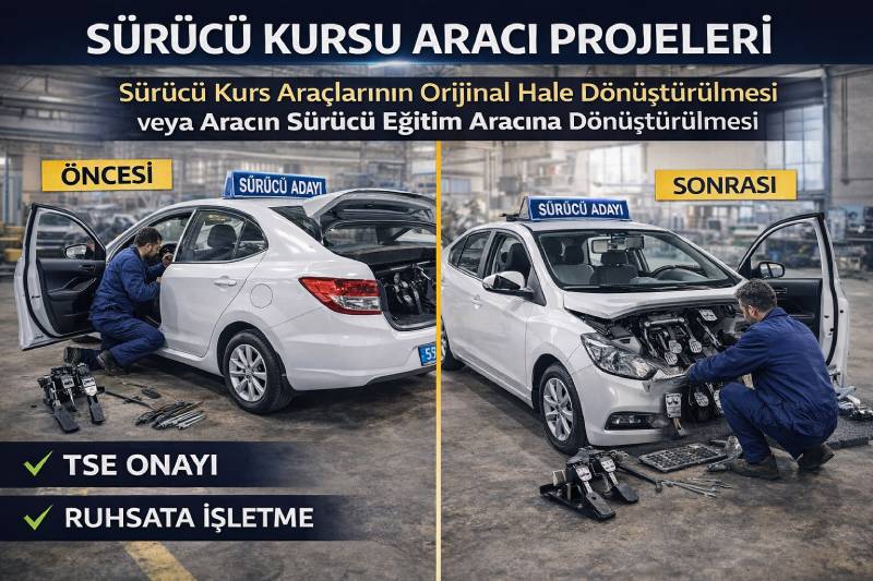 Sürücü kursu araç projeleri; fren, gaz ve bazı durumlarda debriyaj sisteminin yolcu tarafına da eklenmesiyle oluşan teknik tadilatların, TSE mevzuatına uygun şekilde projelendirilmesi ve ruhsata işletilmesi sürecini kapsar.